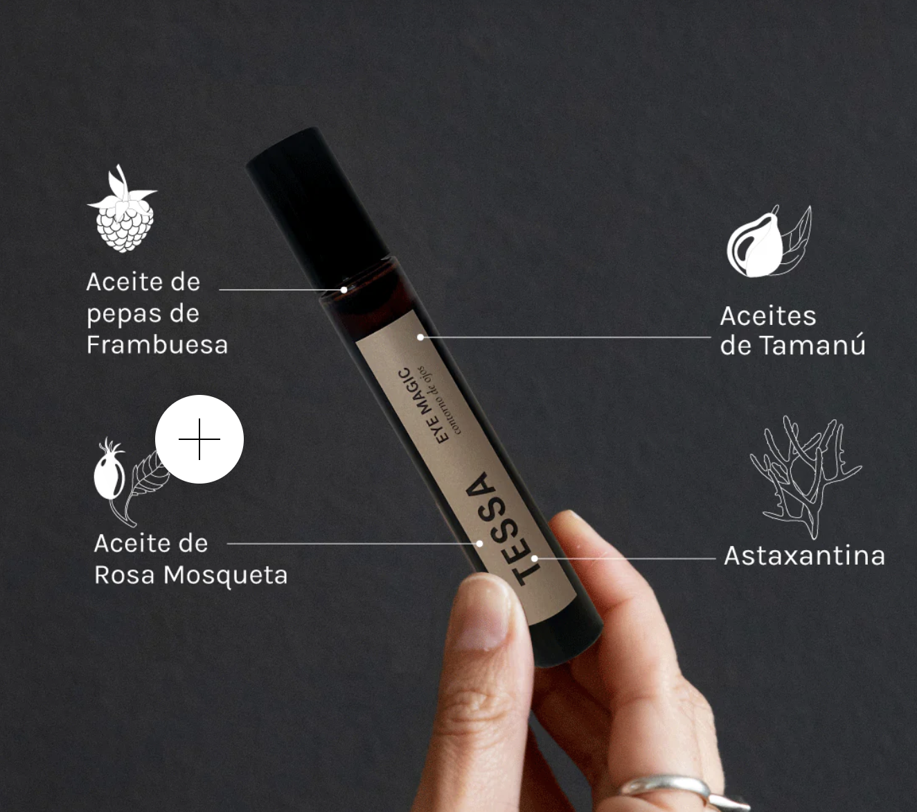 Nuestro eye magic atenúa las ojeras y bolsas alrededor de los ojos, aumenta la circulación, disminuye la apariencia de arrugas y líneas de expresión y restaura la elasticidad de tu piel. Por la concentración de astaxantina (antioxidante), este producto tiene un color anaranjado.