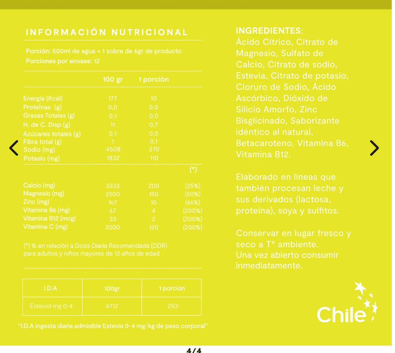 Ingredientes: Ácido Cítrico, Citrato de Magnesio, Sulfato de Calcio, Citrato de Sodio, Citrato de Potasio, Stevia, Cloruro de Sodio, Ácido Ascórbico, Saborizante & Colorante Natural, Dioxido de Silicio, Zinc Bisglicinado, Vitamina B6 y Vitamina B12